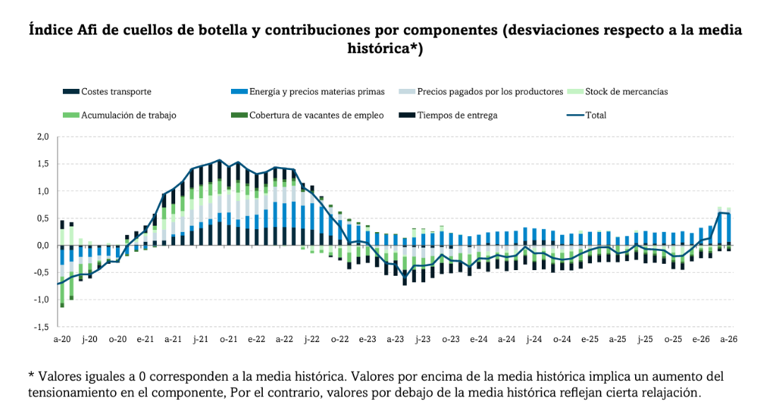 El índice Afi apunta a un aumento de los cuellos de botella, si bien no tan intenso como de hace 5 años. Ahora bien, no es menos cierto que partía de unos niveles mucho más reducidos. En el gráfico adjunto se puede comprobar cómo en 2020 estaba en zona negativa, asociado al hundimiento que se produjo entonces ante la caída de la demanda derivada del confinamiento. Los niveles actuales no son preocupantes, pero está claro que solo han pasado unas semanas desde el inicio del cierre de Ormuz.
