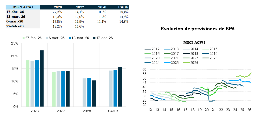 A tenor de la evolución de los mercados financieros, parece que existe más preocupación sobre el impacto que va a tener en inflación que en el crecimiento del PIB. Esta lectura es coherente con la reciente revisión de previsiones del FMI, que anticipa una desaceleración del crecimiento global hasta el entorno del 3,1% en 2026 (frente al 3,4% de 2025 o el 3,3% que anticipaba en enero). No parece un recorte demasiado importante. Tal vez por eso las bolsas han regresado a zona de máximos históricos, impulsadas por el aumento esperado de los beneficios empresariales. Las previsiones a 17 de abril (es decir, ya “interiorizado” el encarecimiento del petróleo) mejoran respecto a las semanas atrás y anticipan un avance del 22,2%.