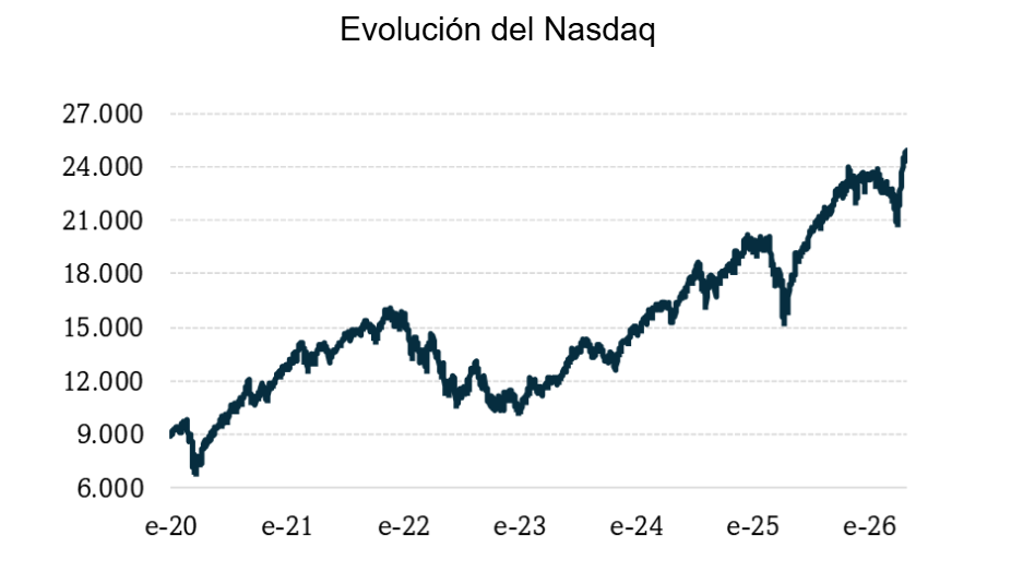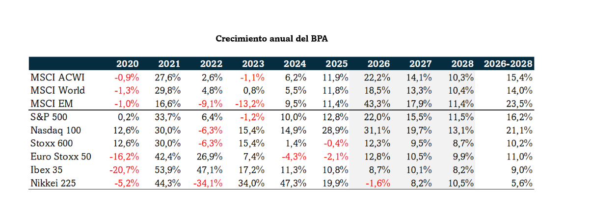 Tras este dato destaca el Nasdaq que, empujado por las denominadas Siete Magníficas, podría registra en 2026 un crecimiento del beneficio por acción (BPA) del 19,7%. ,